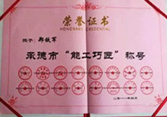 鄭氏砂藝創(chuàng)始人鄭鐵軍,2011年以來,先后獲得 “河北省2010年度民間工藝美術(shù)大師”、“河北省外出務(wù)工致富能手”、 “首屆河北省五大民俗企業(yè)家”、“河北省企業(yè)誠信建設(shè)優(yōu)秀工作者” 、首屆燕趙“文化之星”、“2016-承德市十大行業(yè)領(lǐng)軍人物”、“美麗河北·優(yōu)秀文化能人” 、“承德市拔尖人才”、 “承德市能工巧匠”等榮譽(yù)稱號。
