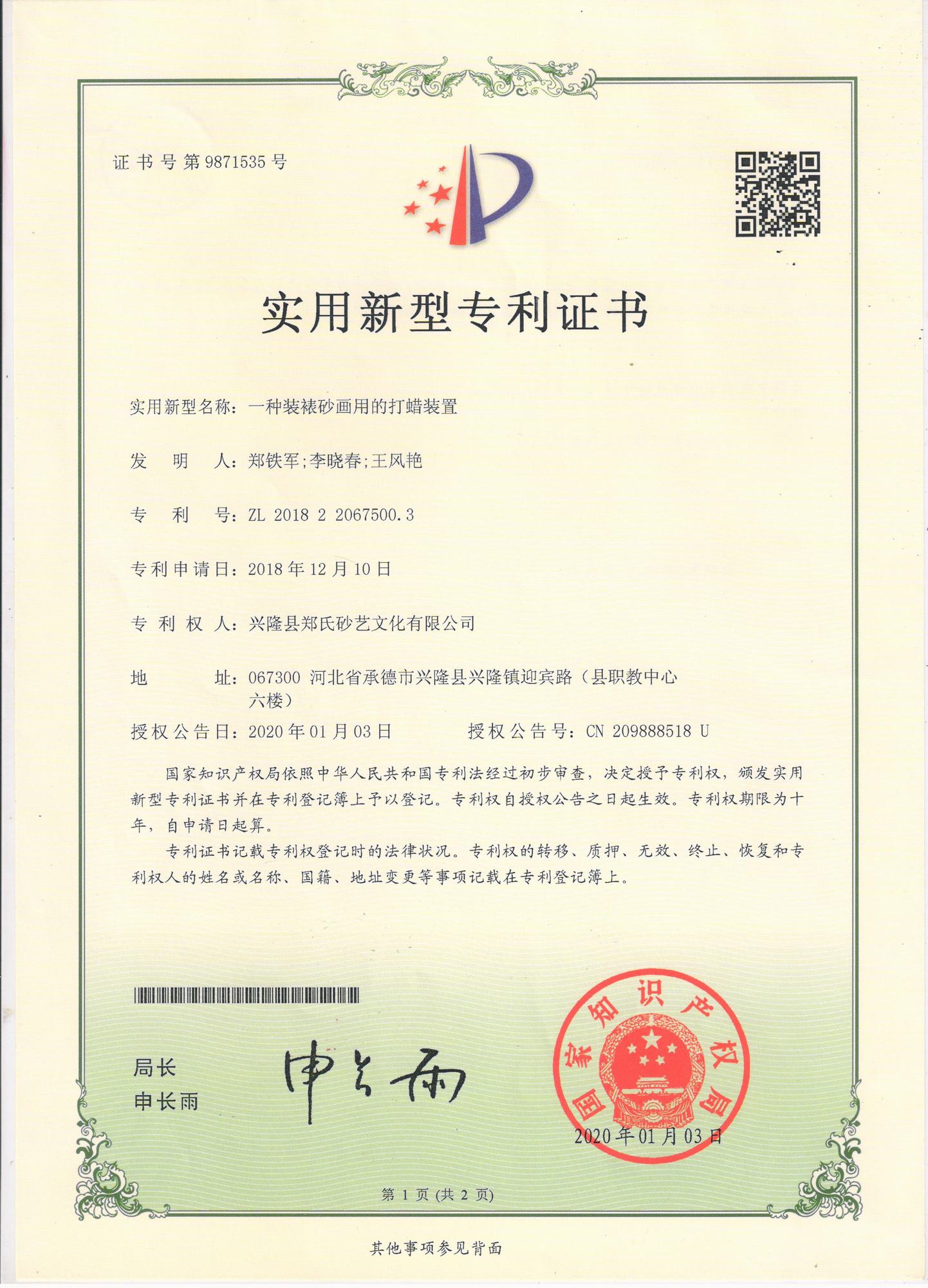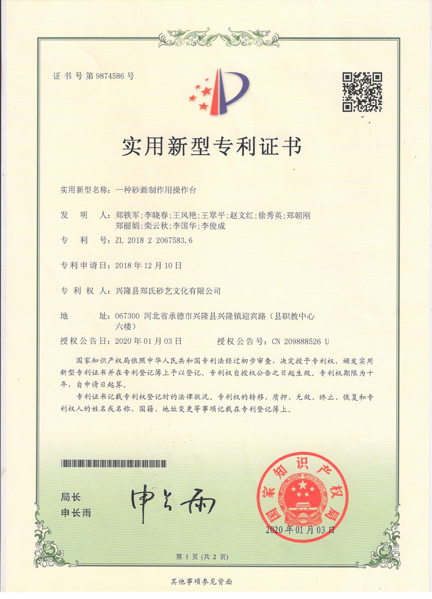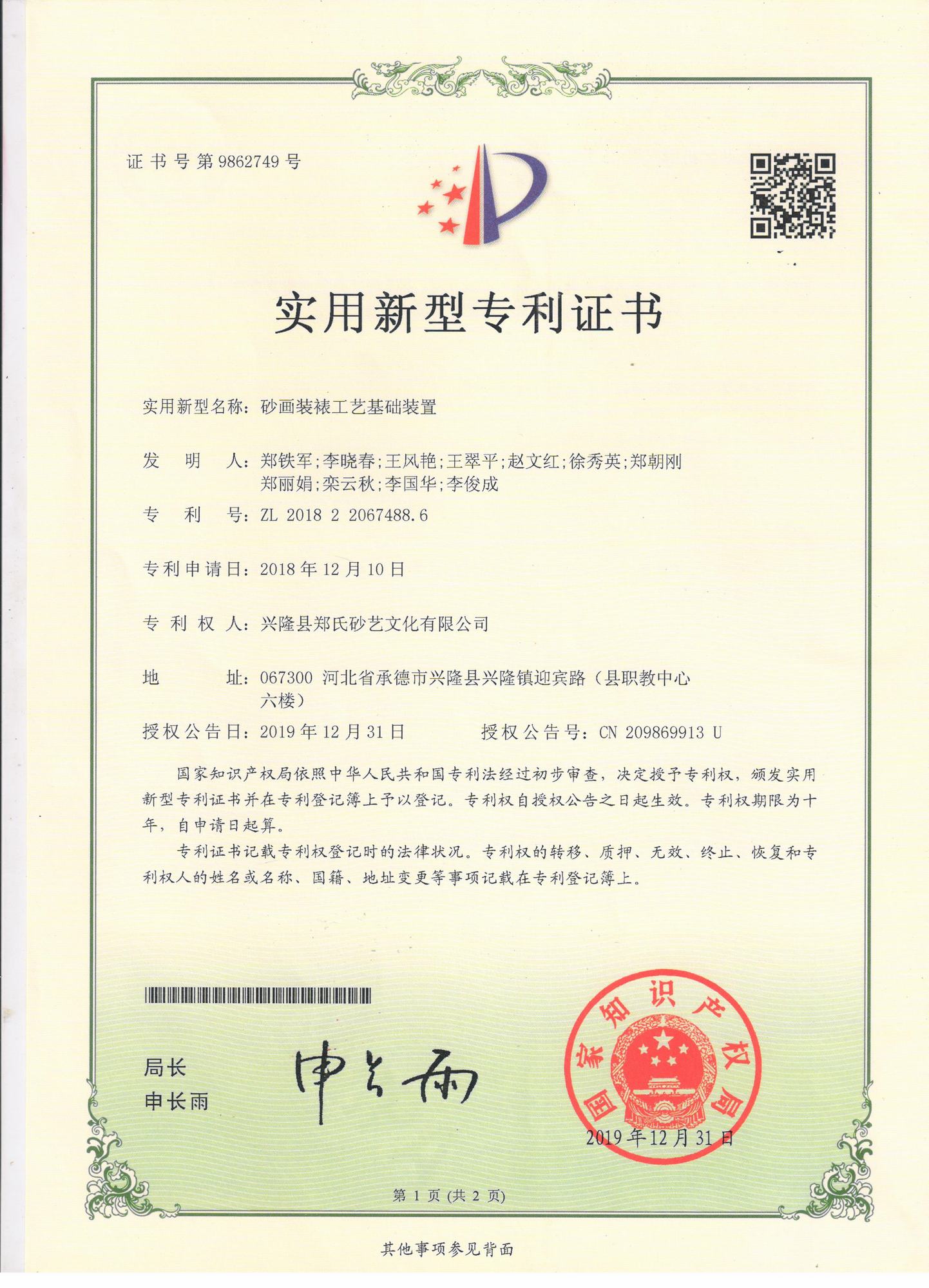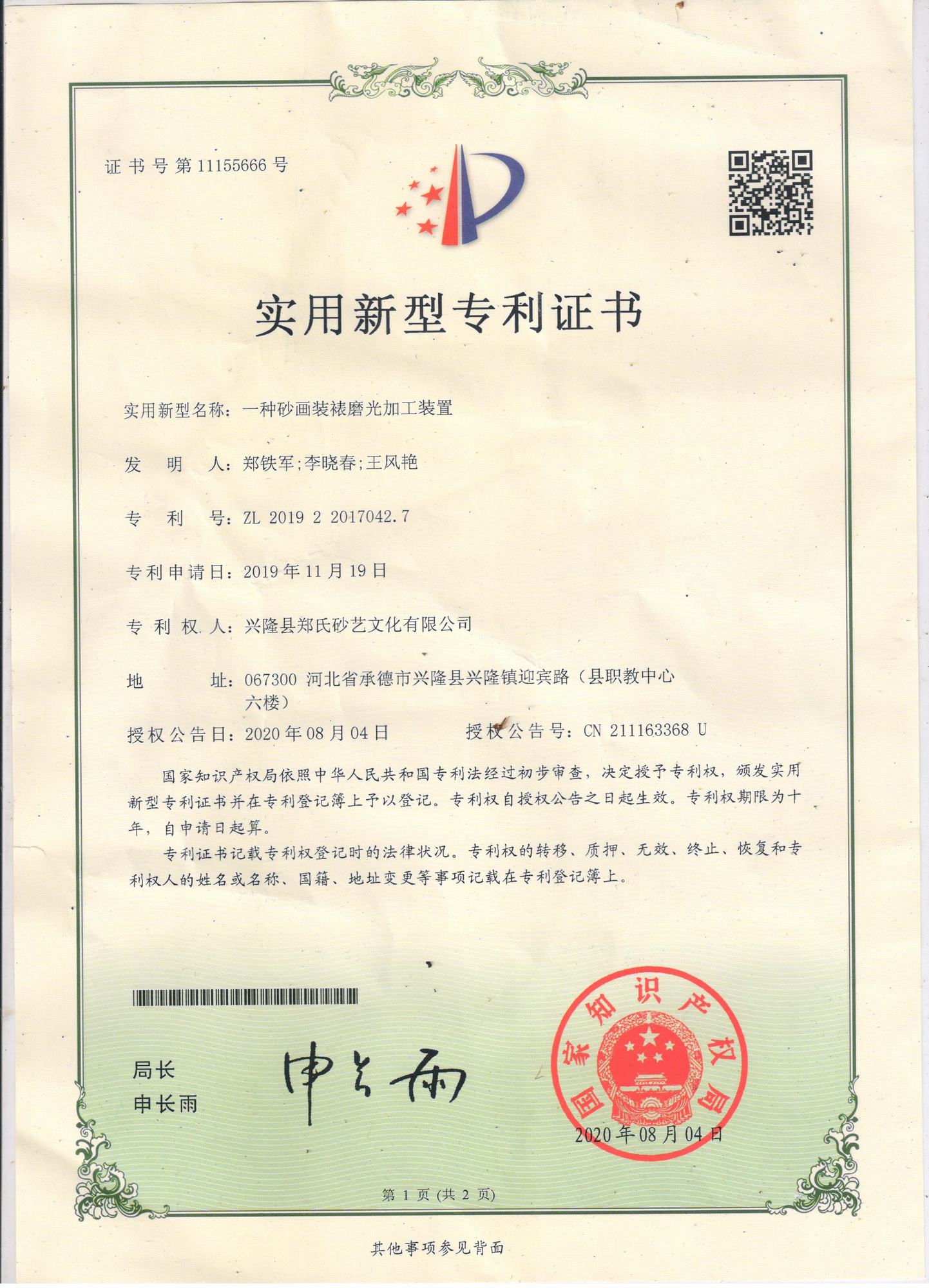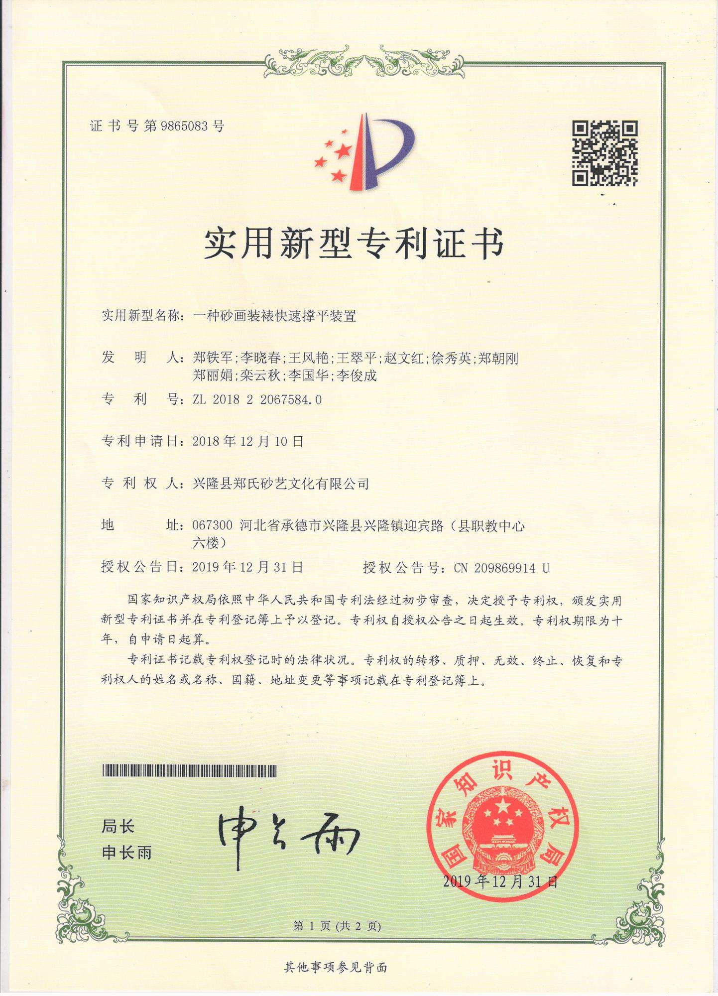 自鄭氏砂藝研究所成立以來,經(jīng)過研發(fā)人員的不懈鉆研和努力,已經(jīng)陸續(xù)研發(fā)和申報了9項擁有自主知識產(chǎn)權的實用新型專利,目前為止9項專利全部獲得國家知識產(chǎn)權局的認定。近年來,公司根據(jù)自身的生產(chǎn)需求,積極成立了鄭氏砂藝研究所并獲得省工業(yè)和信息化廳批準,在研發(fā)過程中,公司先后投入數(shù)十萬元,通過研發(fā)破解了生產(chǎn)過程中的技術難題,9項自主研發(fā)專利的成功也標志著鄭氏砂藝研究所逐步走向成熟。