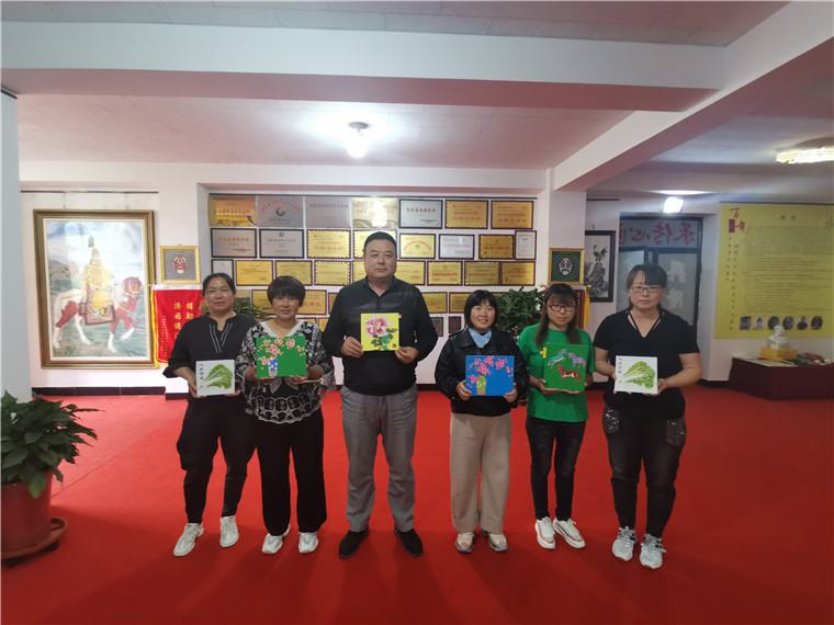 蘑菇峪扶貧生產車間貧困人員和鄭鐵軍董事長在鄭氏砂藝非遺展廳合影留念