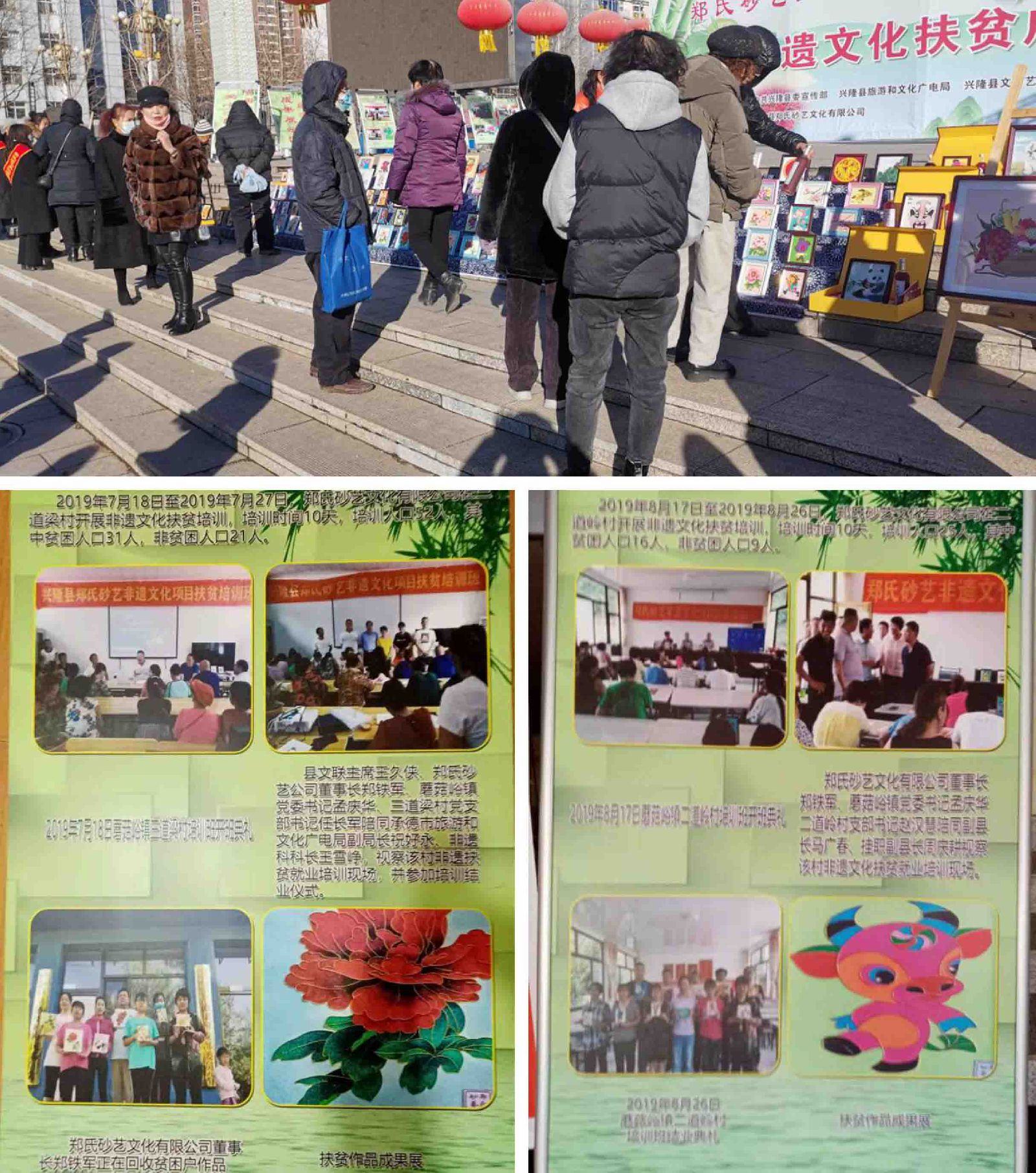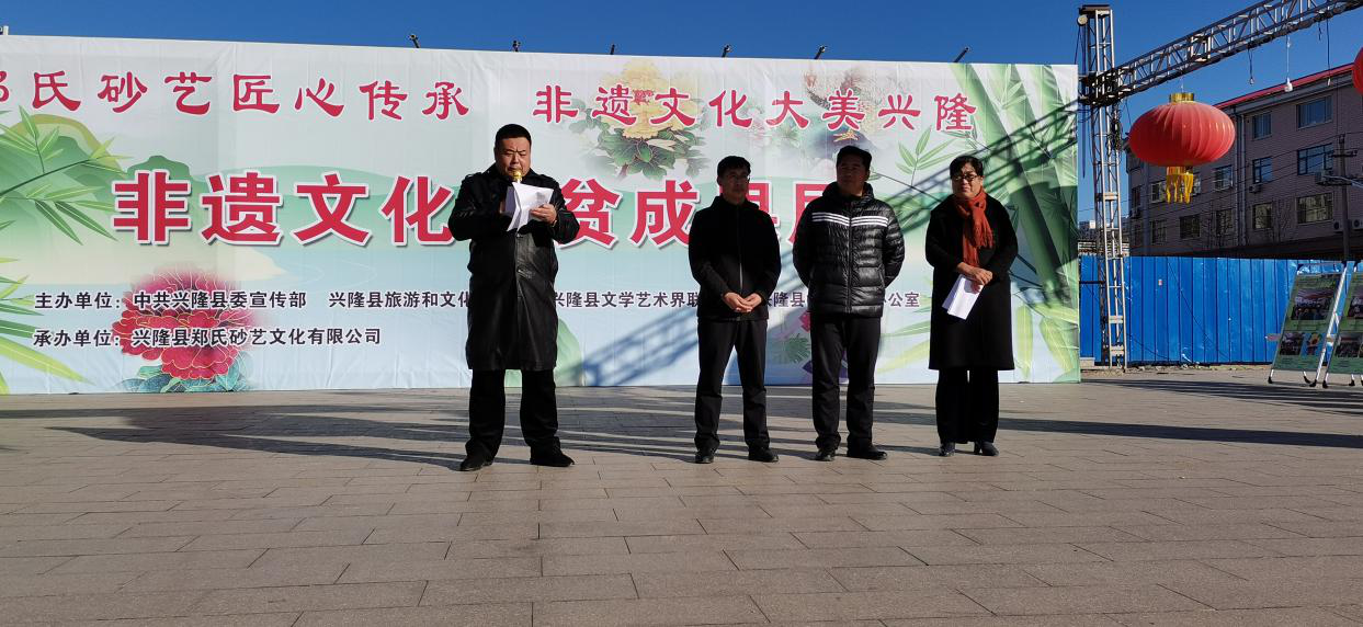2020年11月27日。由中共興隆縣委宣傳部、興隆縣旅游和文化廣電局、興隆縣文學(xué)藝術(shù)界聯(lián)合會、興隆縣扶貧開發(fā)辦公室主辦的、由興隆縣鄭氏砂藝文化有限公司承辦的《非遺文化扶貧成果展》在興隆縣中心廣場拉開帷幕。展會由興隆縣文學(xué)藝術(shù)界聯(lián)合會主席王久俠主持,鄭氏砂藝文化 有限公司董事長鄭鐵軍致開幕詞。文聯(lián)主席王久俠作重要講話。她說:“鄭氏砂藝是祖?zhèn)骷妓?,幾年來鄭氏砂藝積極開展非遺文化扶貧,培訓(xùn)全縣400余名貧困婦女,制作出了具有飽含鄉(xiāng)土氣息,美輪美奐的砂藝作品。讓他們用巧手脫貧致富,為脫貧攻堅作出顯著貢獻?!彪S后縣委宣傳部常務(wù)副部長隋云鵬、縣旅游和文化廣電局黨委書記閆海濤、文聯(lián)主席王久俠由砂藝公司董事長鄭鐵軍、公司工會主席趙文紅等引導(dǎo)下,觀摩了“扶貧培訓(xùn)成果展區(qū)”、“消費扶貧展區(qū)”、“貧困戶作品展區(qū)”及“愛心認購展區(qū)”。四區(qū)展介及作品。對鄭氏砂藝非遺文化扶貧成果給予充分肯定,并興致勃勃地欣賞了鄭氏砂藝美輪美奐的貧困戶作品。