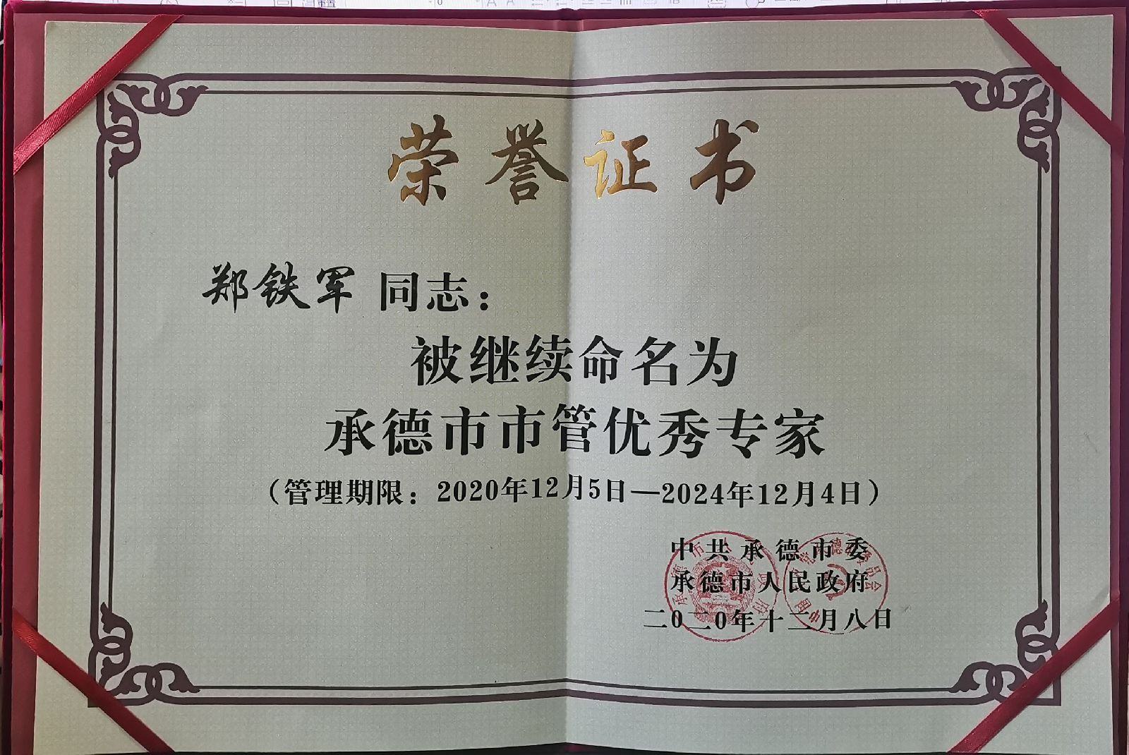 鄭鐵軍董事長再次被中共承德市委、承德市人民政府評為“承德市市管優(yōu)秀專家”
