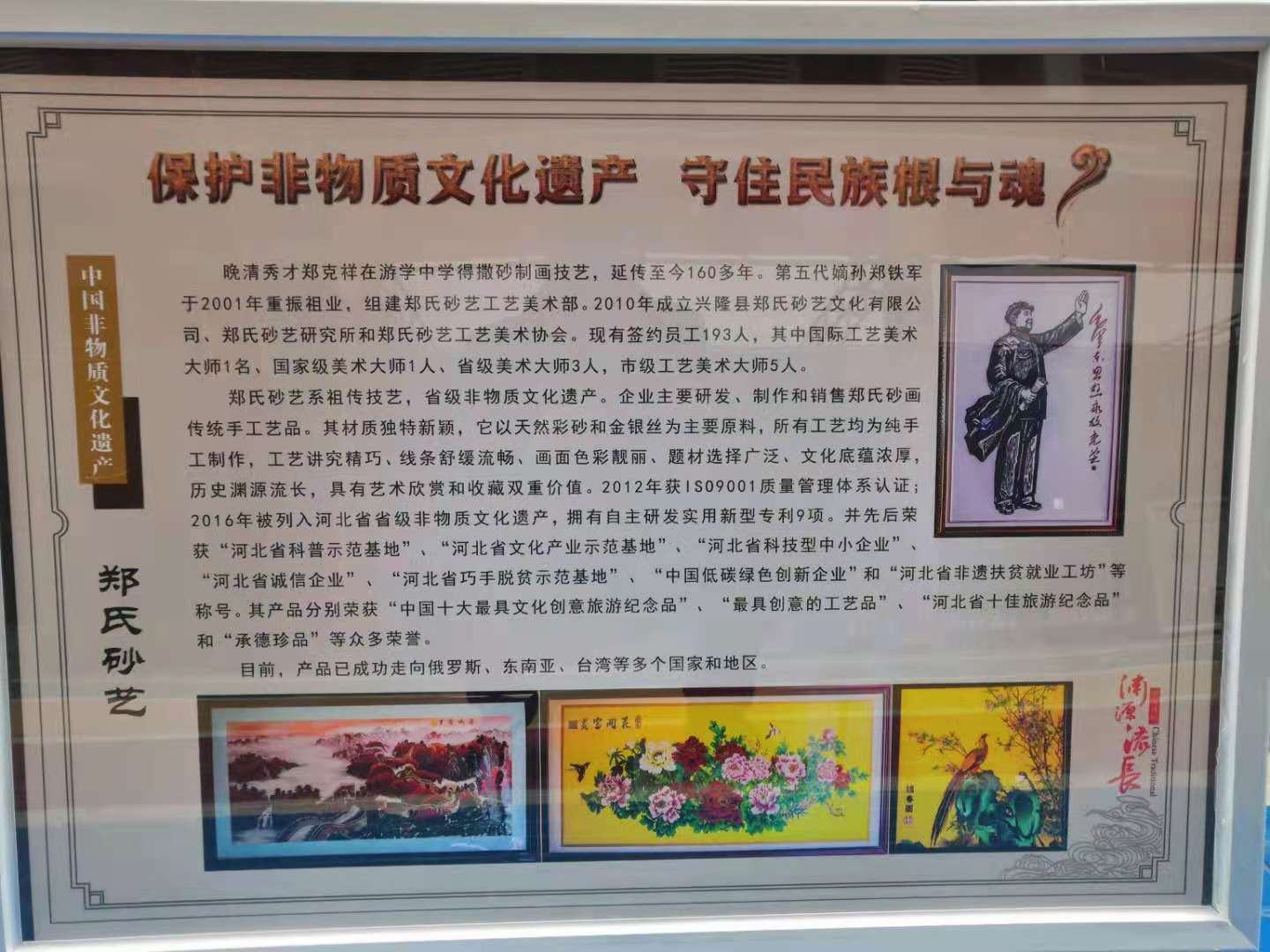 2021年5月15日,鄭氏砂藝應邀參加三河市文化廣電和旅游局 “2021 年中國旅游日京津冀文旅資源推介暨 ‘京東文旅圈’成立”系列活動,活動旨在有效推動京津冀協(xié)同發(fā)展重大國家戰(zhàn)略,加快推進興隆縣、遵化市、三河市等京東九縣(市、區(qū))一體化發(fā)展步伐,構建文旅定位精準清晰、資源高效利用、產(chǎn)業(yè)集群發(fā)展的區(qū)域發(fā)展新格局,共同打造京津冀文旅協(xié)同發(fā)展區(qū)。興隆縣旅游和文化廣電局局長莊云飛帶領我縣特色文旅企業(yè)參加了此次活動,其中鄭氏砂藝代表我縣非遺文化產(chǎn)業(yè)出席活動,展出特色砂畫作品51幅,展出效果良好,得到了參觀人員一致好評。