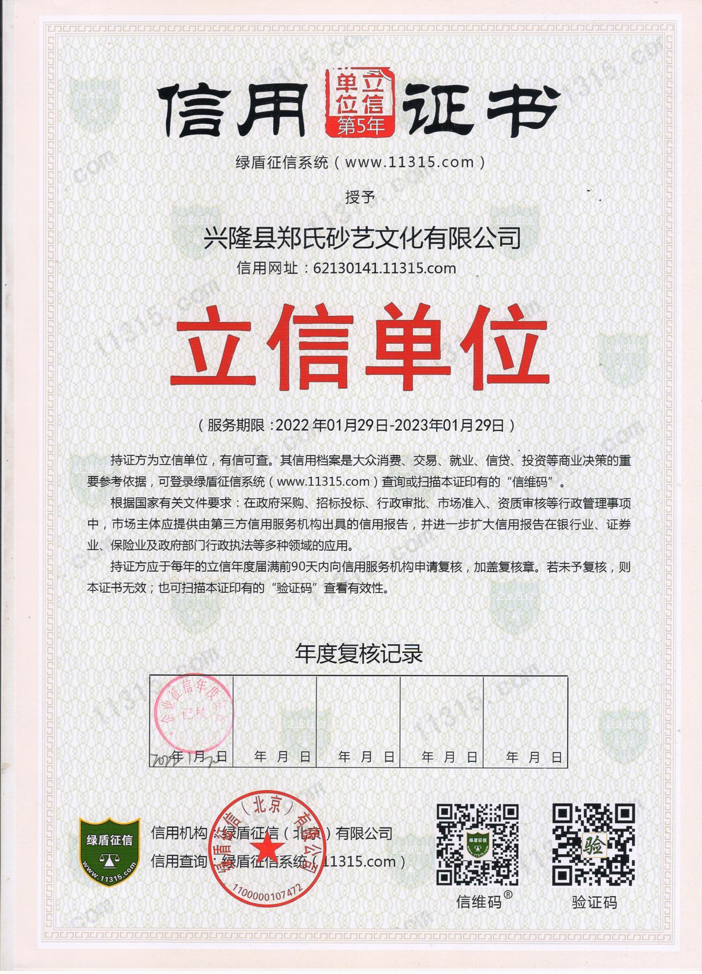 2022年,根據綠盾企業(yè)征信系統(www.11315.com)采集、整理、保存、加工的信息,經綜合信用評價模型自動評估,興隆縣鄭氏砂藝文化有限公司被評為AAA級信用企業(yè),并授予綠盾征信“信用證書”,企業(yè)已連續(xù)五年獲此殊榮。