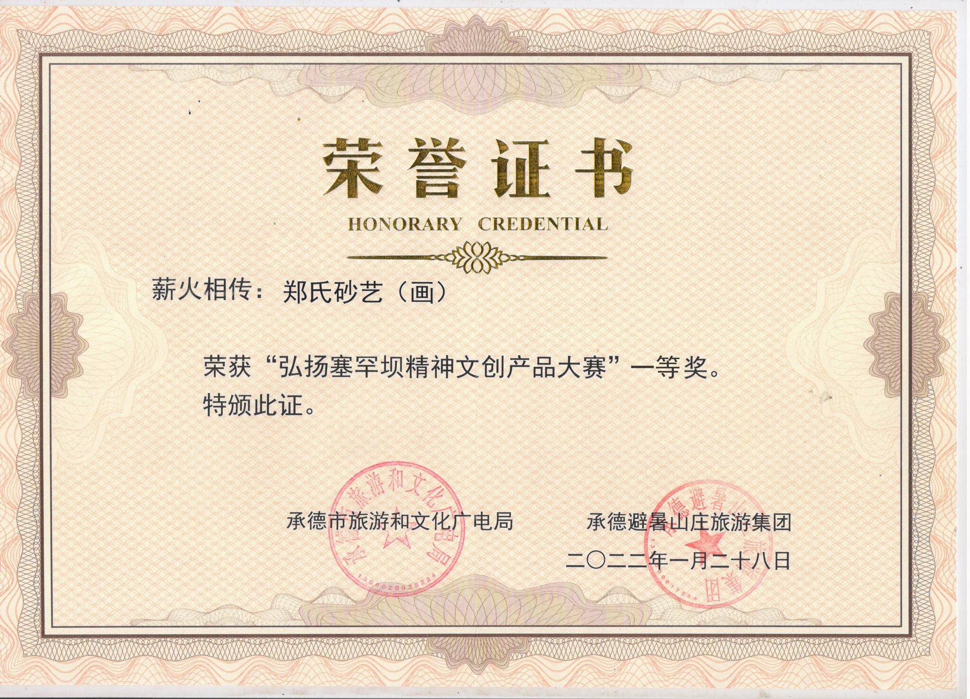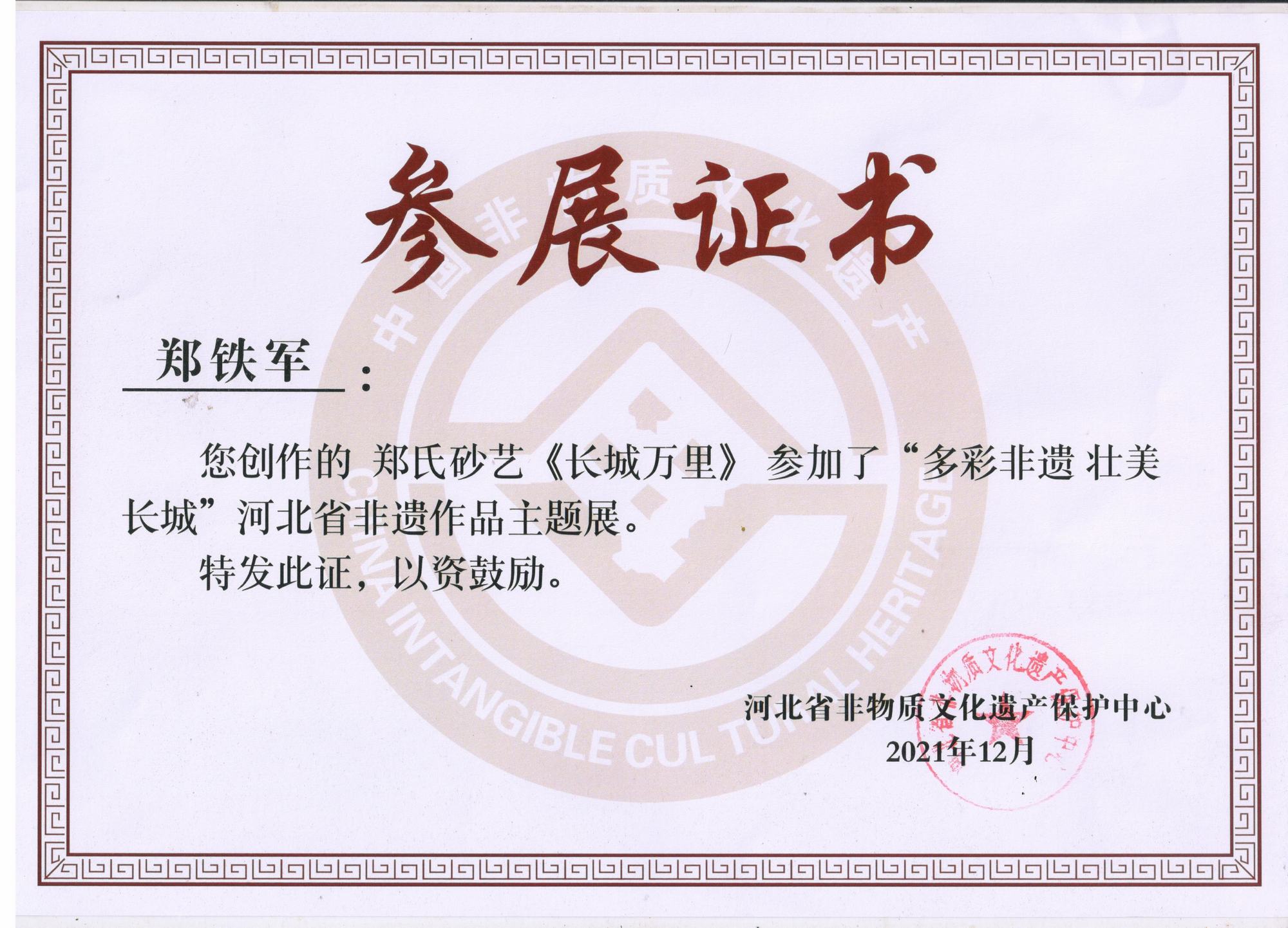 近期,鄭氏砂藝多次應邀參加了省、市相關單位舉辦的各項展出活動,參展的非遺砂畫作品和研發(fā)的旅游商品得到了社會各界人士的一致好評,被活動組委會給予了很大的肯定,在一定程度上提高了我縣和“非遺”文化鄭氏砂藝的知名度。2021年12月,鄭鐵軍董事長的砂畫作品《長城萬里》入選“多彩非遺 壯美長城”河北省非遺作品主題展,并在河北省“非遺”保護中心展出。2022年1月,鄭氏砂藝砂畫作品《薪火相傳》榮獲“弘揚塞罕壩精神文創(chuàng)產品大賽”一等獎。2022年1月,鄭氏砂藝多項作品在承德市旅游協會舉辦的“傳承非遺手工技藝、助力鄉(xiāng)村振興”活動榮獲獎項。2022年2月,鄭氏砂藝董事長鄭鐵軍在全市開展的“鄉(xiāng)村振興黨旗紅 文藝創(chuàng)新樹先鋒”活動中表現突出,榮獲“承德市2021年度優(yōu)秀鄉(xiāng)村文藝家會員”稱號。