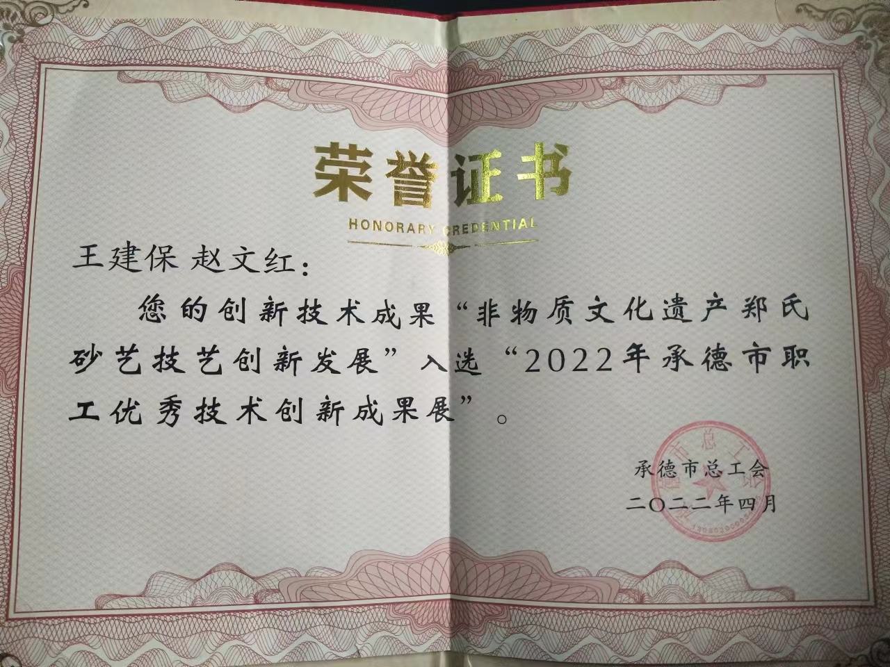 近年來鄭氏砂藝以創(chuàng)新發(fā)展為根本,不斷加大創(chuàng)新研發(fā)投入,引進人才技術,聘請原清華大學文化與旅游產(chǎn)品設計研發(fā)中心總監(jiān)尹建民教授為鄭氏砂藝技術顧問,創(chuàng)新研發(fā)出多種旅游紀念品,并提升改進砂畫制作工藝,使“非遺”砂畫技術和質量不斷提高,期間研發(fā)的9項實用新型專利被國家知識產(chǎn)權局認定,新產(chǎn)品多次參加國家、省、市地區(qū)舉辦的文化產(chǎn)業(yè)博覽會,并榮獲“中國十大最具文化創(chuàng)意旅游紀念品”、“最具創(chuàng)意的工藝品”、“河北省十佳旅游紀念品”和“承德珍品”等百余項榮譽,倍受中外廣大客戶青睞。企業(yè)先后榮獲“河北省科普示范基地”、“河北省文化產(chǎn)業(yè)示范基地”、“河北省科技型中小企業(yè)”、“河北省誠信企業(yè)”、“河北省巧手脫貧示范基地”、“中國低碳綠色創(chuàng)新企業(yè)”和“河北省非遺扶貧就業(yè)工坊”等眾多稱號。目前,產(chǎn)品已成功走向美國、英國、法國、德國、俄羅斯、東南亞等多個國家和地區(qū)。