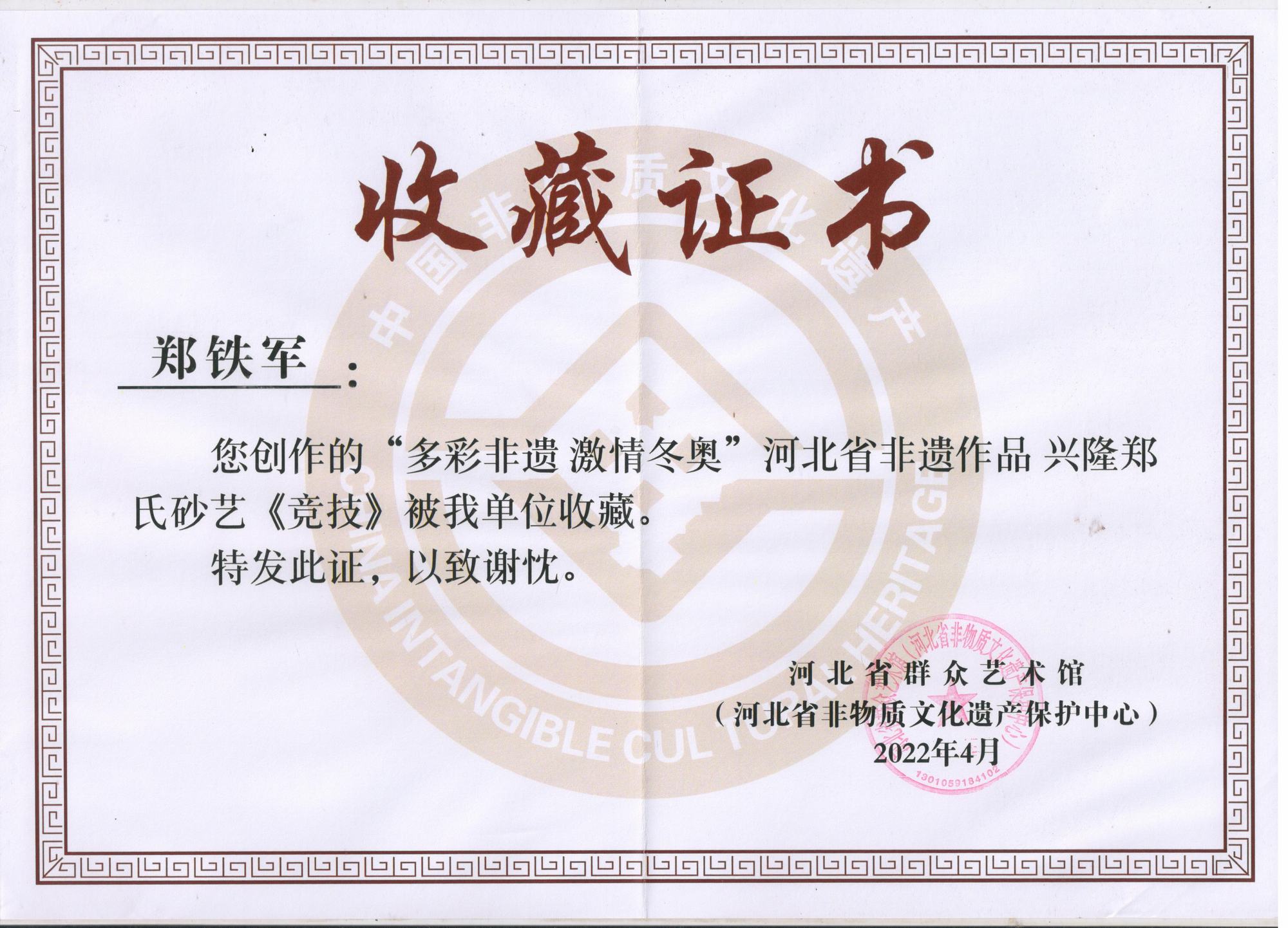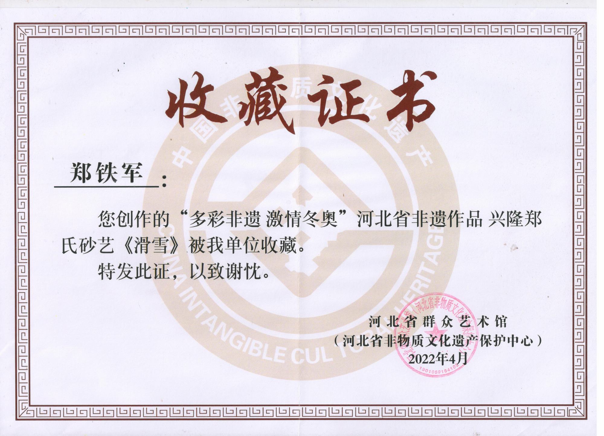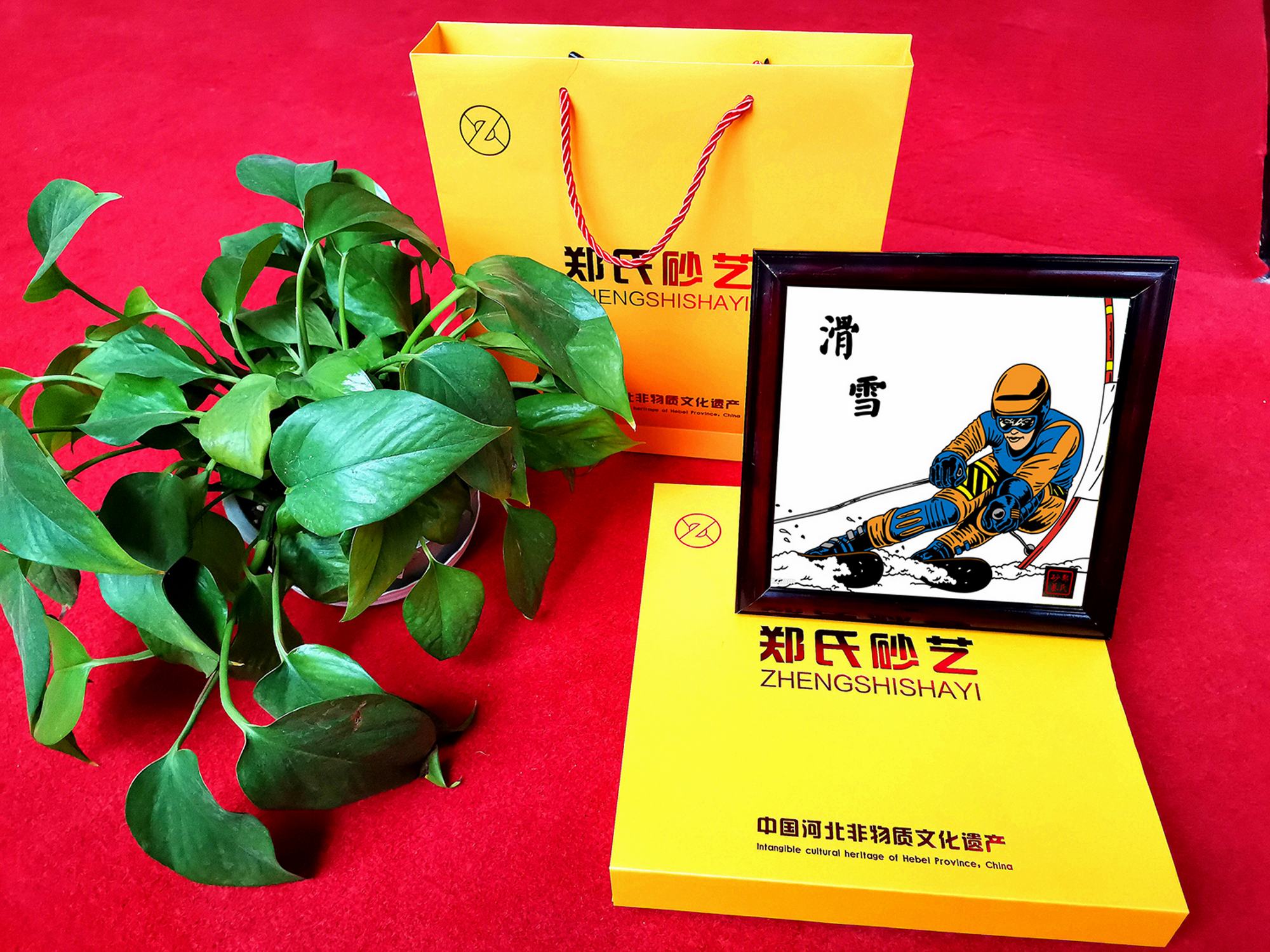 2022年北京冬奧會是我國重大歷史節(jié)點的重大標志性活動,也是河北省推動京津冀協(xié)同發(fā)展、雄安新區(qū)規(guī)劃建設(shè)、冬奧會籌辦“三件大事”之一。因此省群眾藝術(shù)館(省非遺保護中心)按照河北省文化和旅游廳的部署在全省開展了“多彩非遺激情冬奧”非遺主題作品征集活動,本次作品以冬奧文化、冰雪文化、春節(jié)文化為題材,通過藝術(shù)展現(xiàn)冰雪運動,應(yīng)邀鄭氏砂藝執(zhí)行董事國際工藝美術(shù)大師鄭鐵軍創(chuàng)作的砂畫作品《滑雪》、《競技》兩幅作品參展,并被省群眾藝術(shù)館和省非物質(zhì)文化遺產(chǎn)保護中心永久收藏。