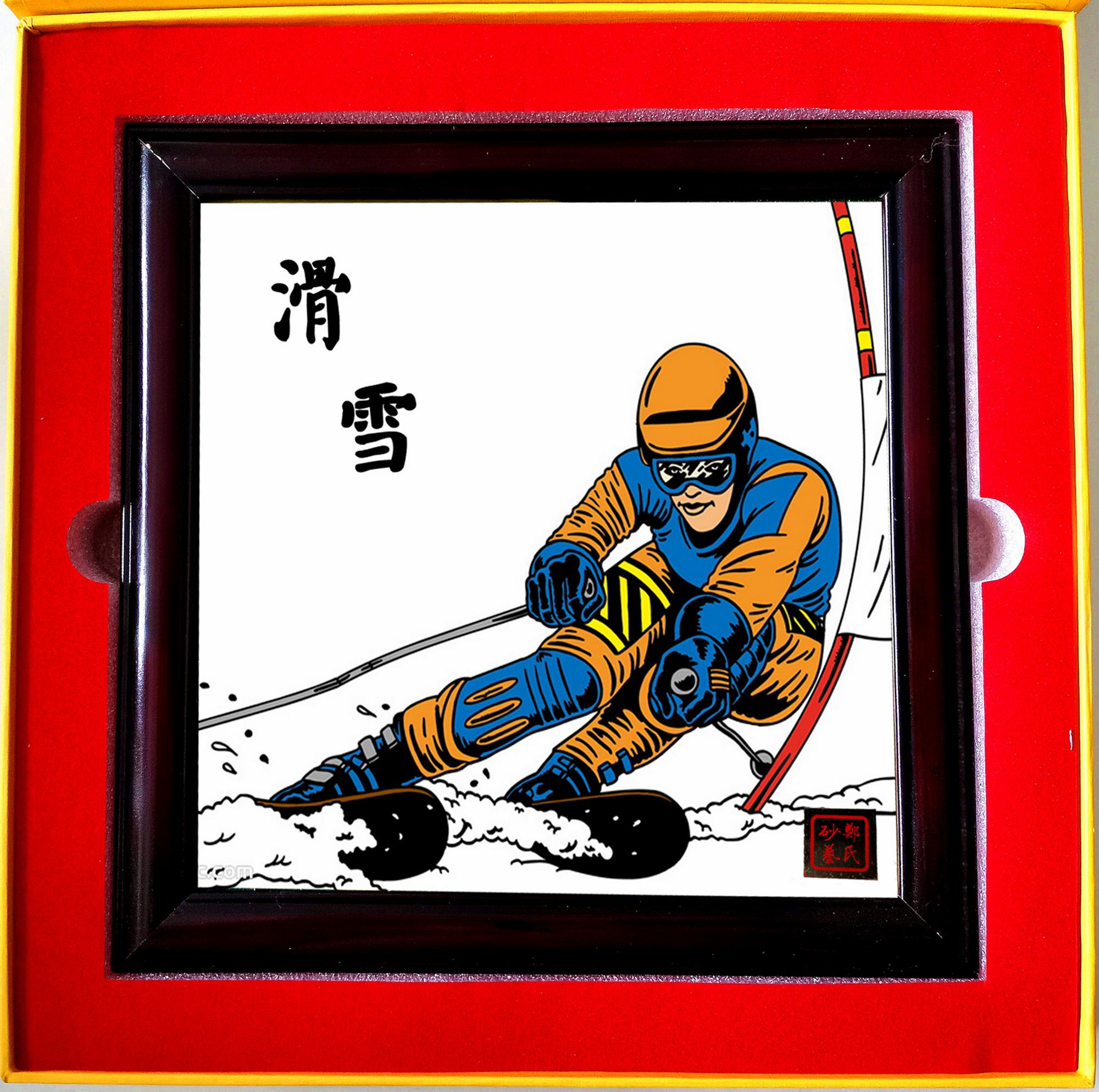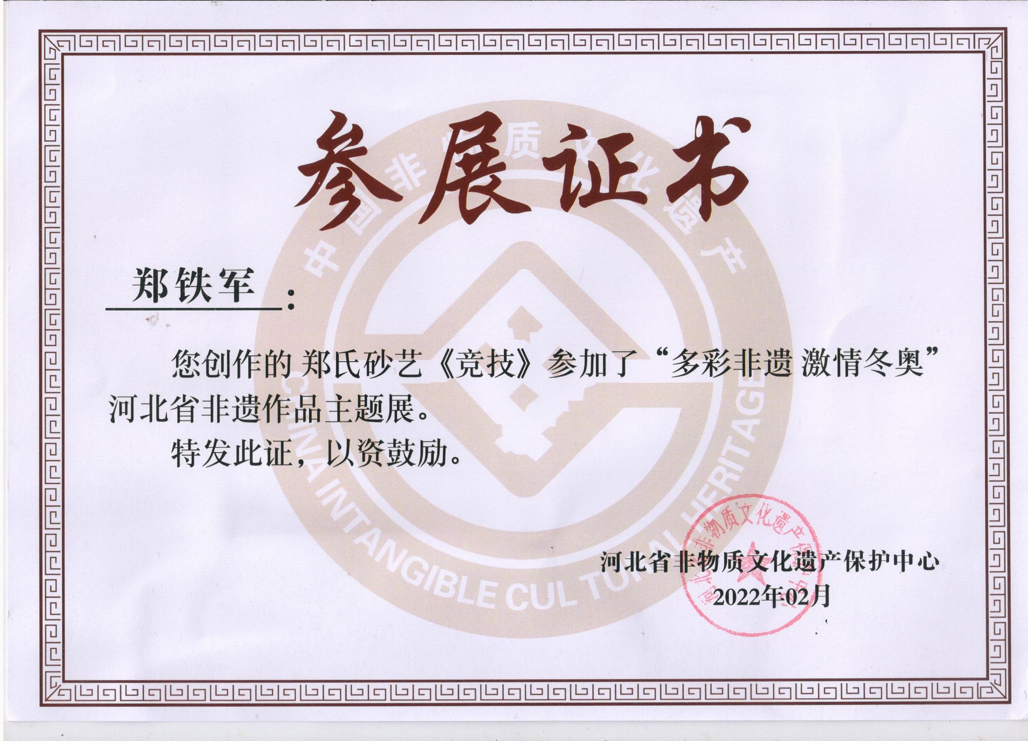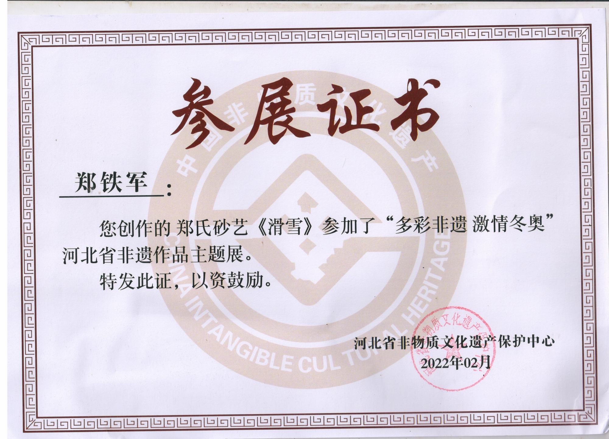 2022年北京冬奧會是我國重大歷史節(jié)點的重大標志性活動,也是河北省推動京津冀協(xié)同發(fā)展、雄安新區(qū)規(guī)劃建設(shè)、冬奧會籌辦“三件大事”之一。因此省群眾藝術(shù)館(省非遺保護中心)按照河北省文化和旅游廳的部署在全省開展了“多彩非遺激情冬奧”非遺主題作品征集活動,本次作品以冬奧文化、冰雪文化、春節(jié)文化為題材,通過藝術(shù)展現(xiàn)冰雪運動,應(yīng)邀鄭氏砂藝執(zhí)行董事國際工藝美術(shù)大師鄭鐵軍創(chuàng)作的砂畫作品《滑雪》、《競技》兩幅作品參展,并被省群眾藝術(shù)館和省非物質(zhì)文化遺產(chǎn)保護中心永久收藏。