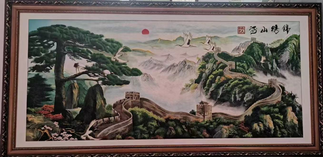 整幅畫以高山、長城、云霧、旭日、大雁、迎客松以及巧妙的畫技呈現(xiàn)了祖國大好河山的壯麗景色。,畫中山情水勢,脈落分明,虛實并舉,映帶盤旋,具有"神而不盡"的詩情畫意。所以這幅《錦繡山河》是會議室、辦公室和居家裝飾的最佳裝飾品!是鎮(zhèn)宅納財之靈寶,具有極高的觀賞和收藏多重價值!