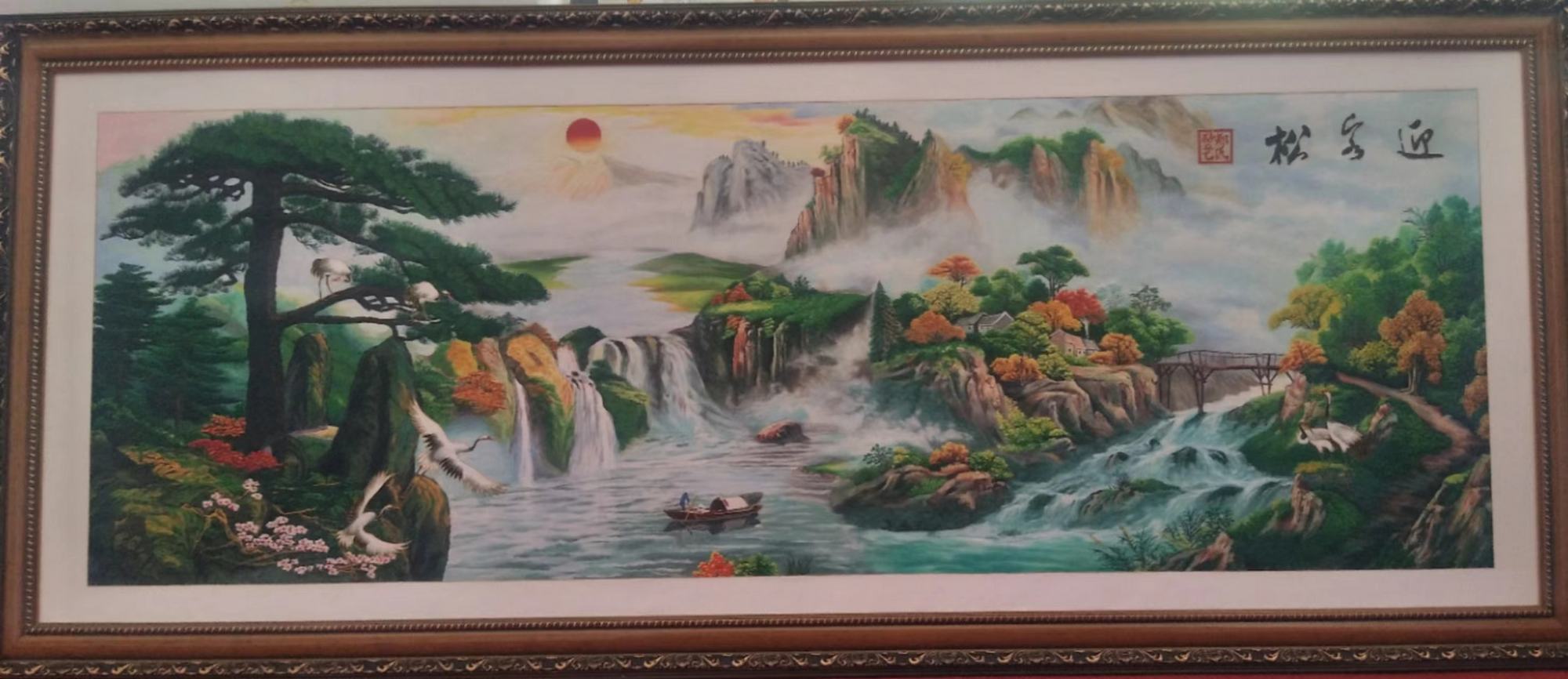 這幅《迎客松》遠(yuǎn)景旭日東升,輕煙淡巒,云煙浮動,云霞卷舒;近景綿綿群山,山勢險峻,波濤洶涌,草木澤生,洋溢著盎然生機(jī)。而那垂直的瀑布,不禁讓我想起詩仙李白的一首詩:“飛流直下三千尺,疑是銀河落九天”。自古以來,古松便蒼天筆挺,有君子之威風(fēng),是祈福之寓意。這幅畫構(gòu)圖遠(yuǎn)虛近實,近景突兀、遠(yuǎn)景清雅,筆力剛勁挺拔、渾厚沉著、墨氣明潤,濃淡虛實相生。當(dāng)然這幅畫寓意迎福招財。是會議室、辦公室和居家裝飾之首選,有生意興旺,迎客招財?shù)淖T?作品寓意美好,作為禮品贈送給親朋好友也是上佳選擇!