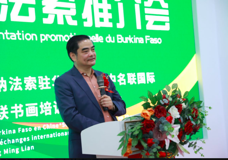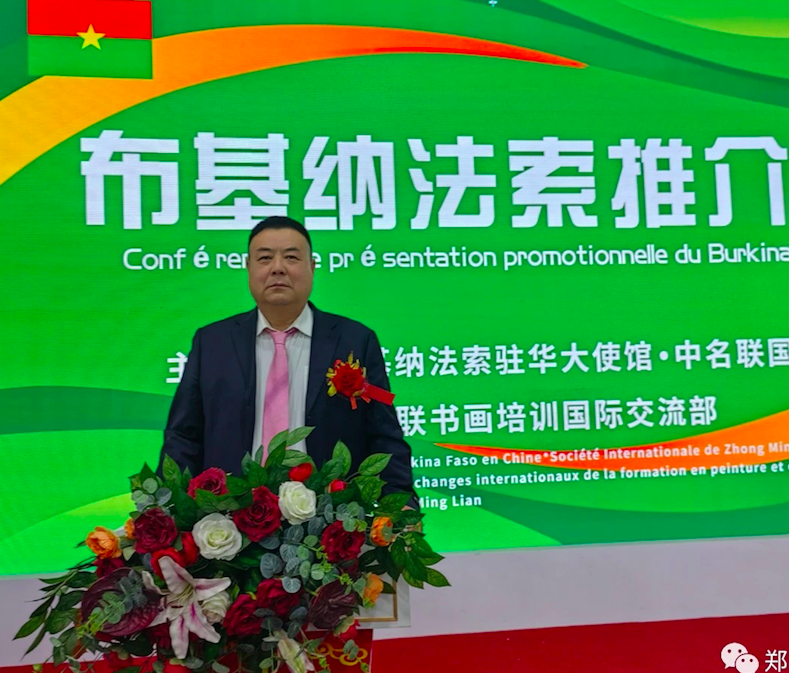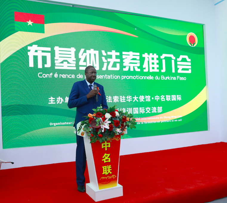 (中名聯(lián)文創(chuàng)園圖片說明:布基納法索共和國駐華大使館領(lǐng)導(dǎo)帕爾﹣伊薩﹣約瑟夫先生上臺演講,明確表示非常開心在中名聯(lián)國際展廳舉辦布基納法索國家推介會)