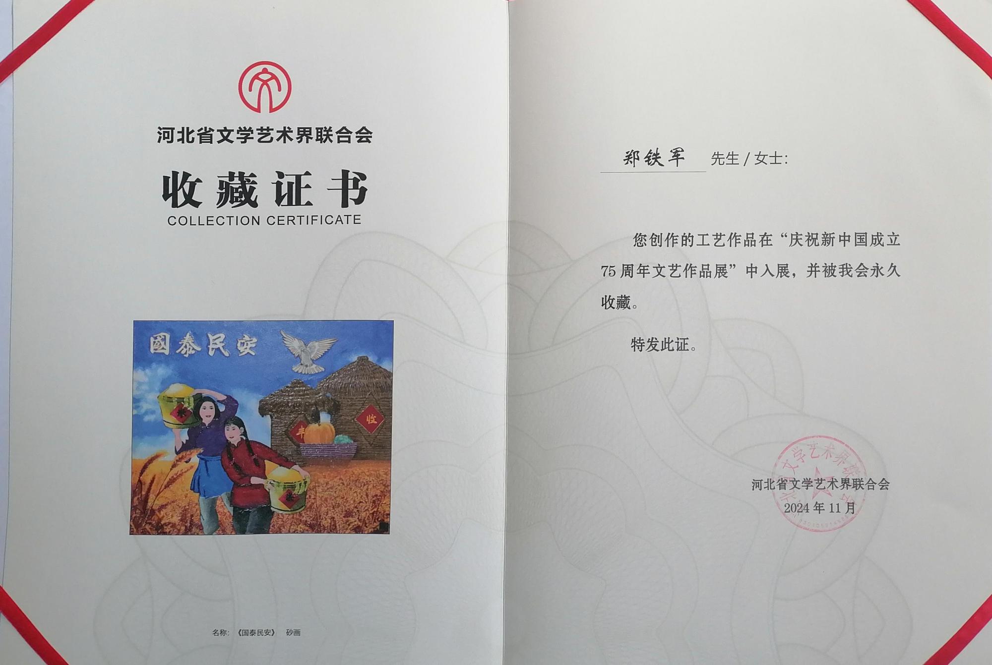 近期,在河北省文學(xué)藝術(shù)界聯(lián)合會舉辦的“慶祝新中國成立75周年文藝創(chuàng)作展”中,由鄭鐵軍創(chuàng)作的《國泰民安》憑借其獨特的藝術(shù)魅力和深厚的文化底蘊,被河北省文學(xué)藝術(shù)界聯(lián)合會永久收藏,成為本次展覽的一大亮點。