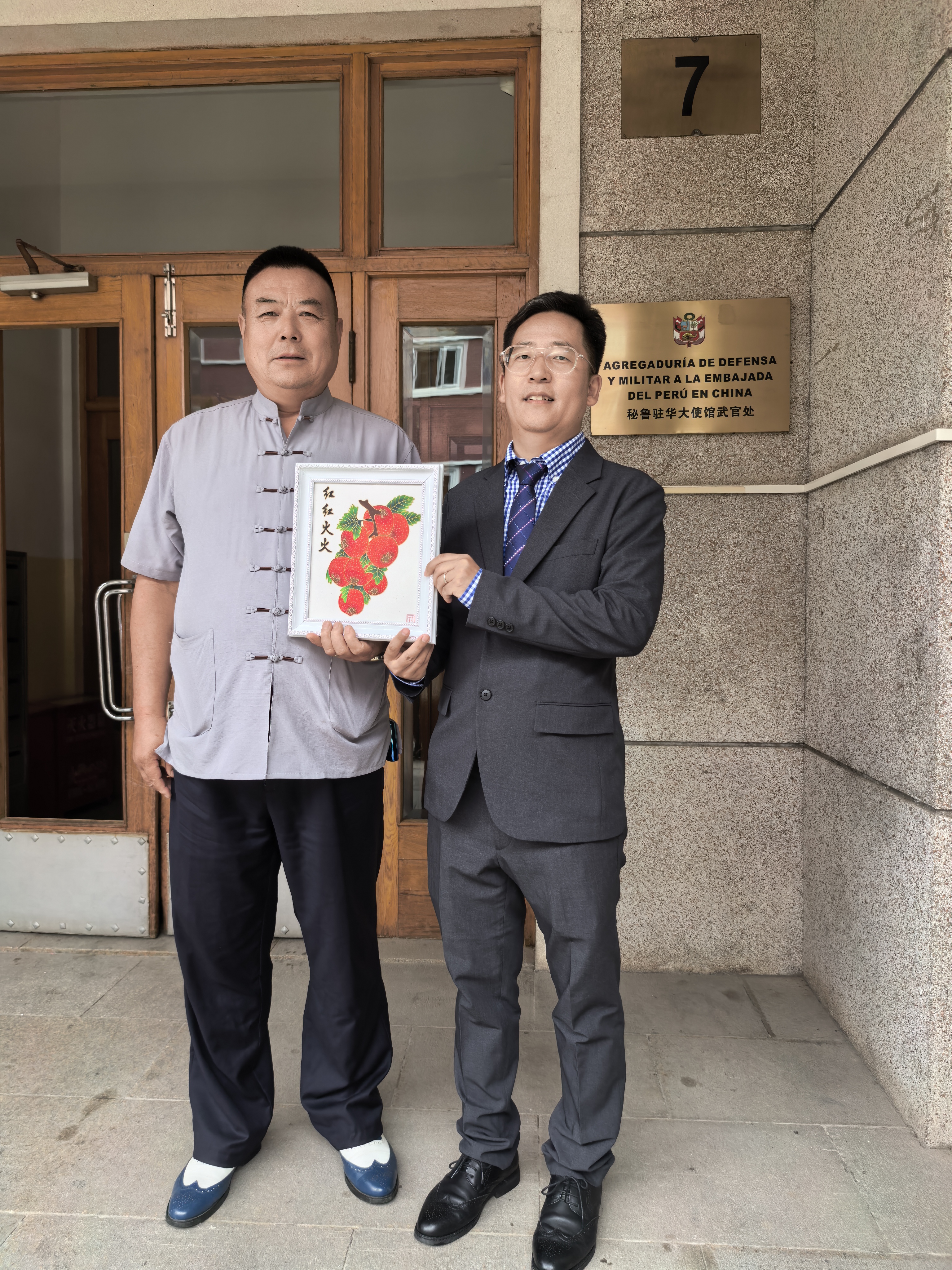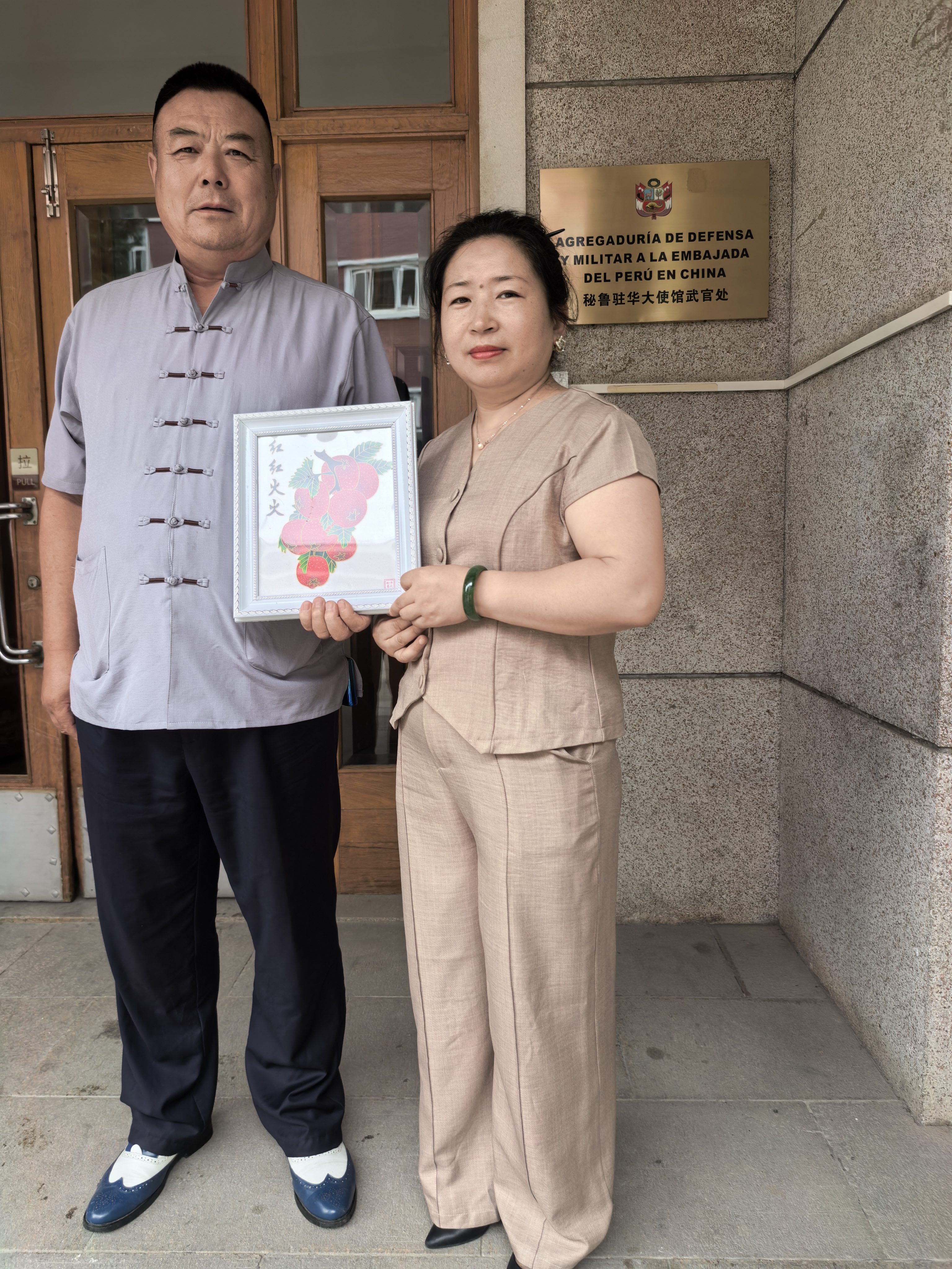 秘魯駐華大使館國防兼陸軍武官處大使對鄭鐵軍先生的來訪表示了熱烈歡迎并給予了熱情接待。在親切友好的交流氛圍中,鄭鐵軍先生闡釋了選擇《紅紅火火》作為贈禮的深刻寓意。他表示,作品以鮮艷的中國紅為主色調(diào),寄托著對中秘兩國人民友誼長存、關(guān)系發(fā)展如同作品名稱一般“紅紅火火”、蒸蒸日上的美好祝愿。