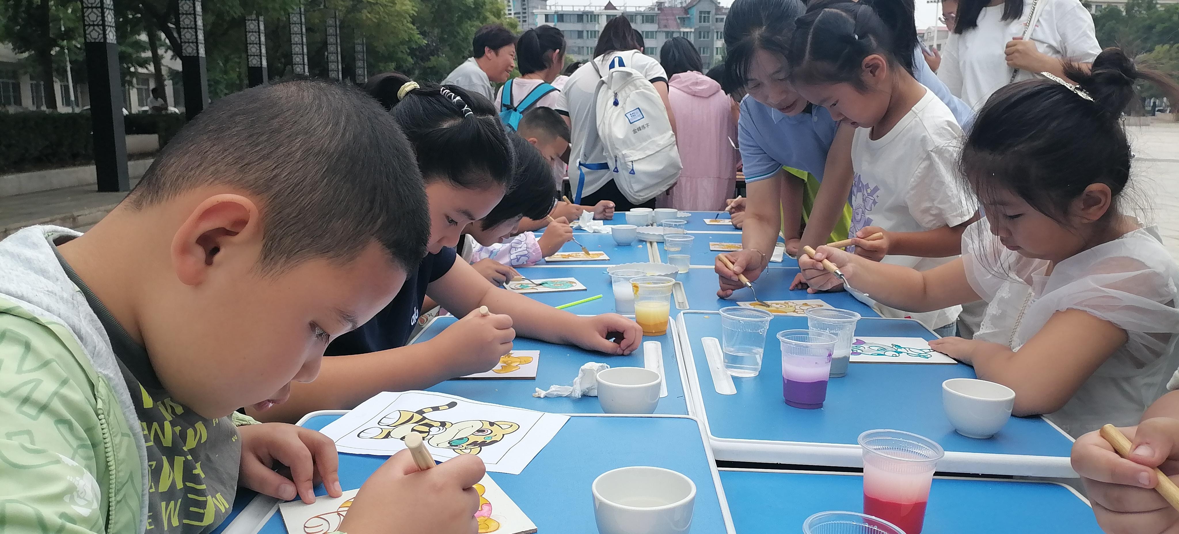 活動(dòng)現(xiàn)場(chǎng),鄭氏砂藝的“天然彩砂+金銀絲”工藝成為孩子們的“興趣焦點(diǎn)”。作為興隆縣的省級(jí)非遺項(xiàng)目,鄭氏砂藝以天然礦物彩砂為原料,采用金絲銀線勾勒?qǐng)D案輪廓,再填充彩砂的傳統(tǒng)手法,既保留了鄉(xiāng)土文化特色,又蘊(yùn)含著非遺技藝的巧思。為讓孩子們輕松參與,技師們特意提前制作了粘好金絲的半成品——一幅幅待填充的砂畫(huà)作品,將“最精彩的創(chuàng)作環(huán)節(jié)”留給孩子。“我要給小虎的臉涂綠色!”“我喜歡藍(lán)色的眼睛!”孩子們圍坐桌前,手持作畫(huà)小鏟,認(rèn)真地將色彩砂石填入金絲框架,同時(shí)互相交流“配色秘訣”,現(xiàn)場(chǎng)充滿了童真與熱鬧。