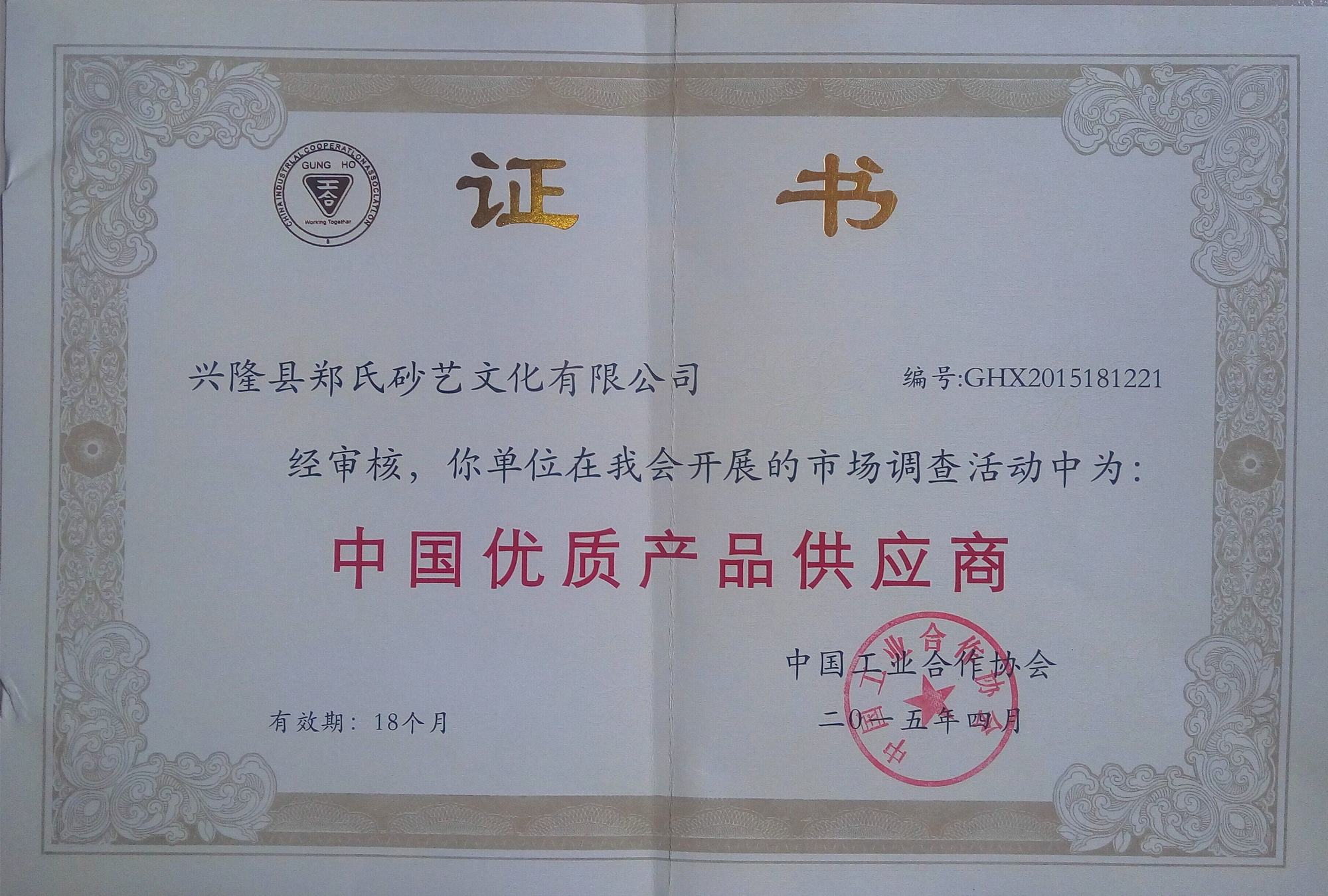 2015年4月,鄭氏砂藝被中國(guó)工業(yè)合作協(xié)會(huì)確定為《中國(guó)優(yōu)質(zhì)產(chǎn)品供應(yīng)商》。