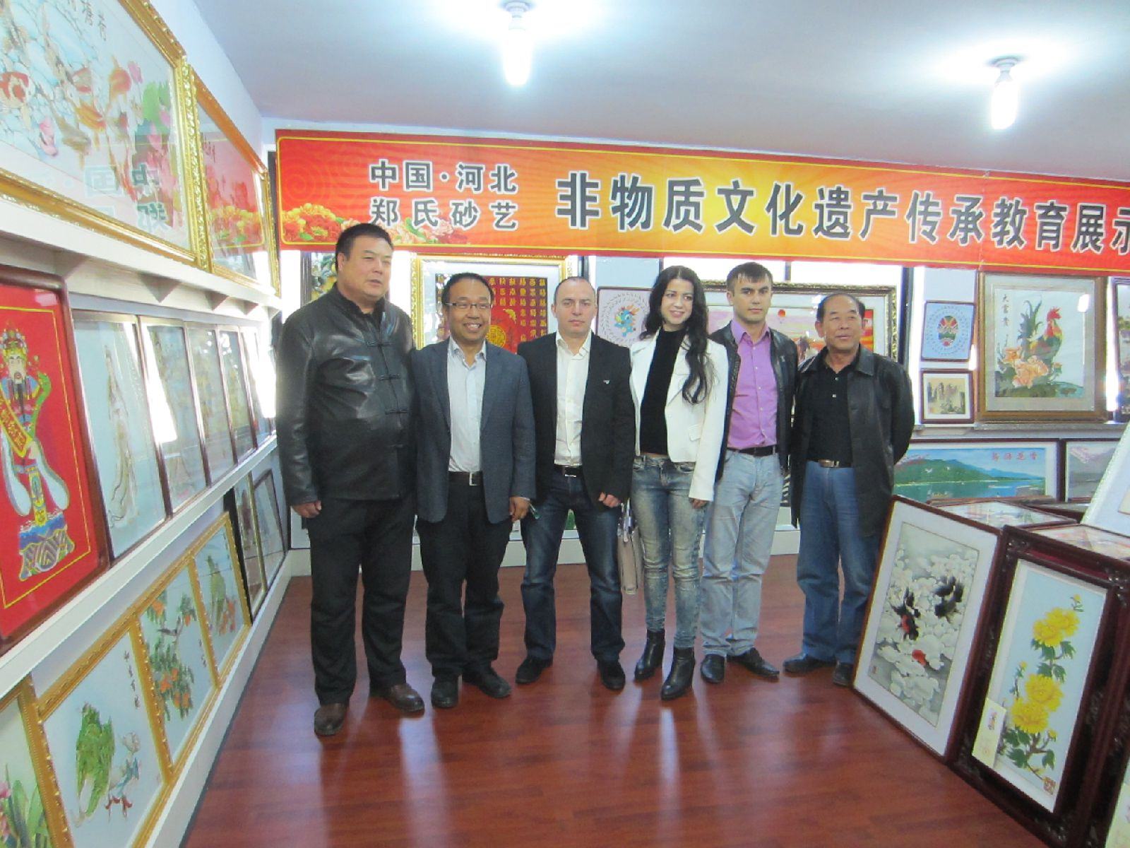 2016年10月17日下午,天津中新天生態(tài)城濱海外國(guó)語(yǔ)大學(xué)董事夢(mèng)祺兼任英語(yǔ)翻譯率領(lǐng)俄羅斯客商勞拉女士(AURA)、鮑家先生(BURTIA)和阿列克謝先生(ALEXANDRIA)來(lái)到興隆縣鄭氏砂藝公司,對(duì)鄭氏金銀絲砂畫(huà)制作車(chē)間、傳統(tǒng)工藝、展廳進(jìn)行了商務(wù)性考察。鄭氏金銀絲砂畫(huà)的傳統(tǒng)工藝、精美的做工和豐富多彩的主題畫(huà)面,引起了客商們的極大興趣和關(guān)注。雙方還就產(chǎn)品交易對(duì)接等工作達(dá)成了初步意向。